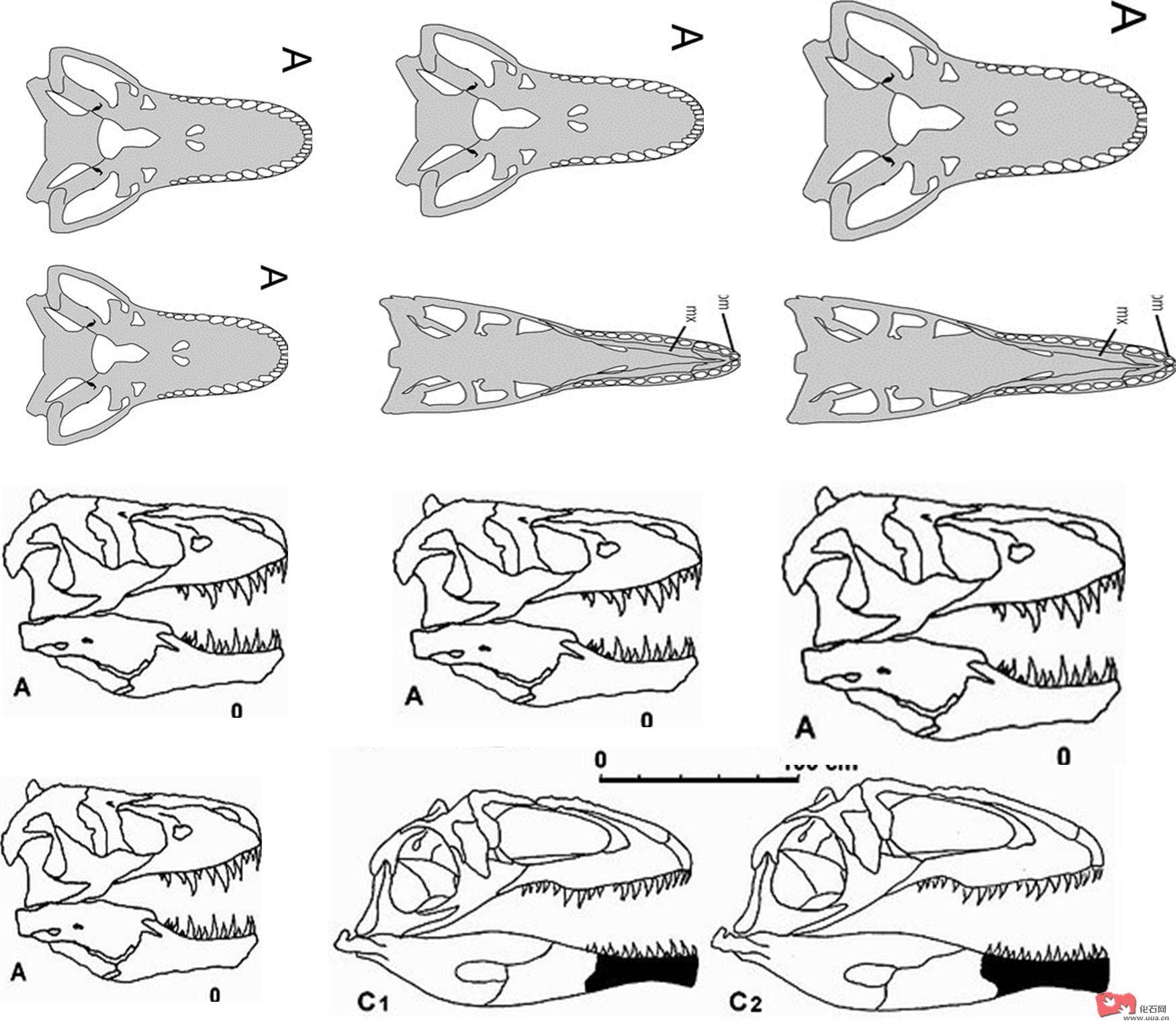 霸王龙从小到大,Scotty(这个体重很大,9500kg,但是头部比较小,东北加拿大霸王龙种群差异) 长度131cm,宽度90cm,BHI 3033(7850kg),长度141cm,宽度92厘米,FMNH PR 2081(10250kg),长度153cm,宽度97厘米,UCMP 137538(16000kg),长度171厘米,宽度119厘米,南巨MUCPv-CH1 长度180厘米,宽度60厘米,MUCPv-95,长度195厘米,宽度65厘米。
