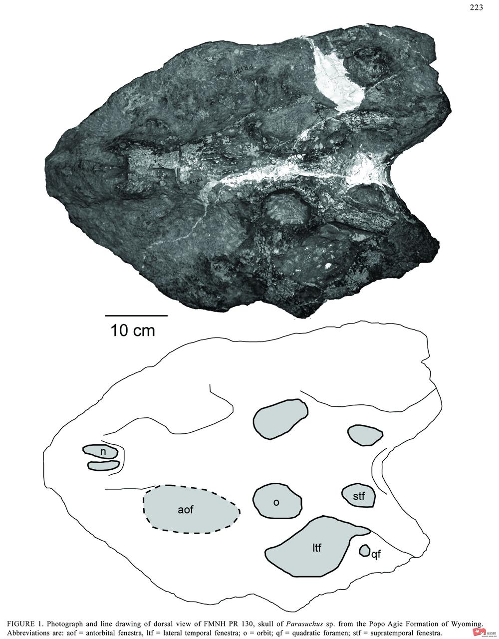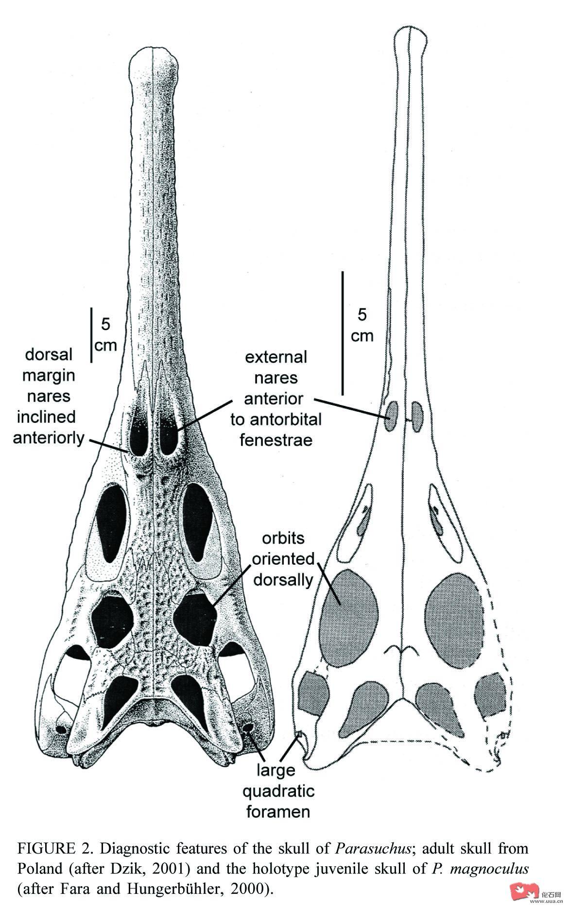 parasuchus的头骨化石FMNH PR 130,保留长度590mm,最宽处415mm,估测最大长度1.5米(最低估测1.17米,不可靠,因为参考标本缺少吻尖),是最大的头骨之一,不过Sereno和Colbert描述的另外两个头骨外(1.6米,1.4米)可以与其匹敌。
