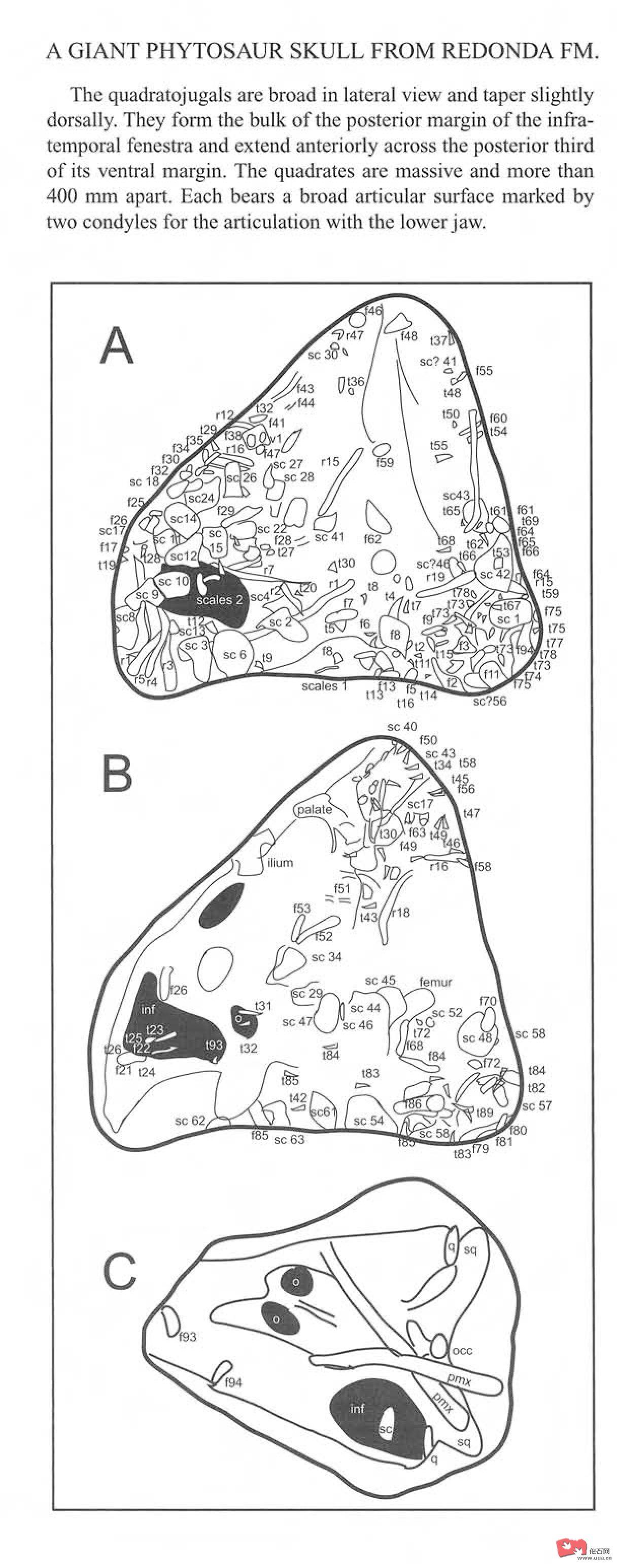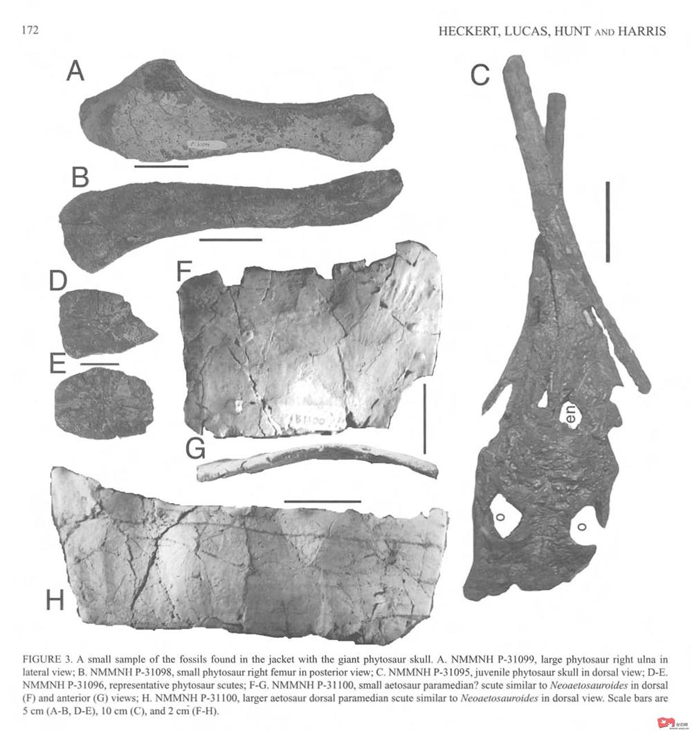 上图: 大植龙头骨,下图其他的骨骸和一些小型的植龙类