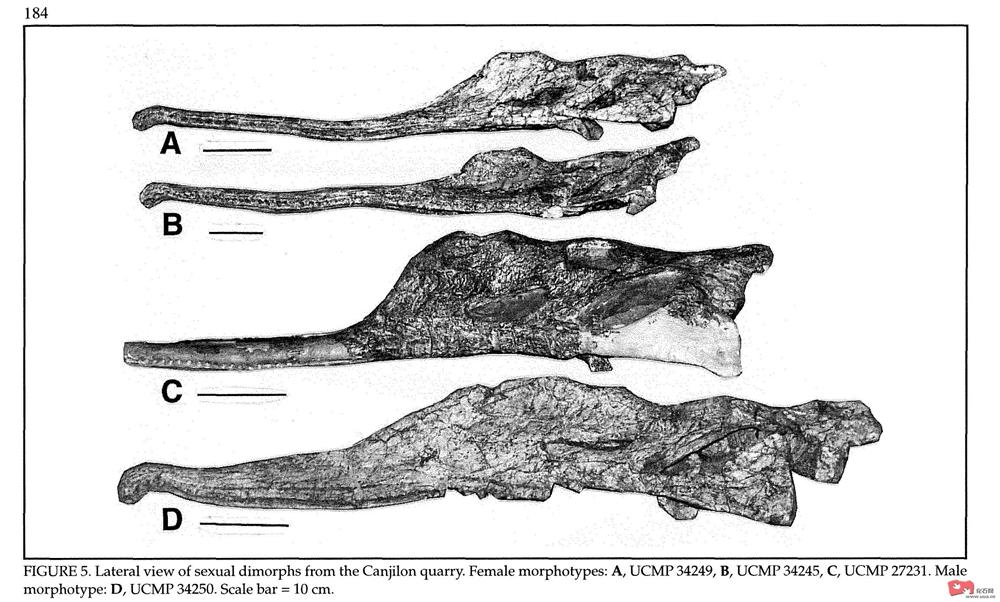 植龙的Canjilon quarry一起发现的骨骼里面发现的标本里面认为有冠的是雄性,较小的,无冠,吻部较细长的是雌性