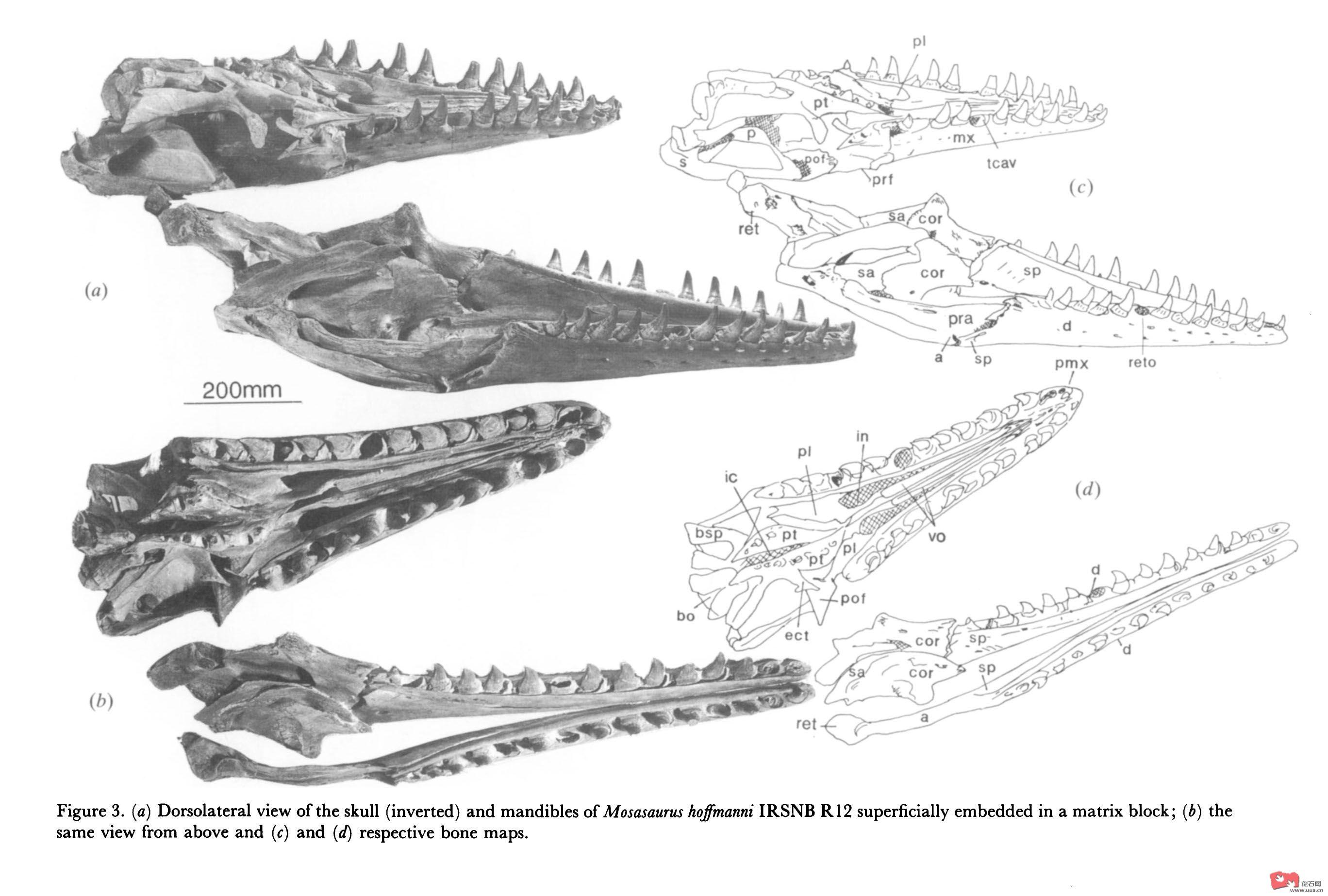 Tylosaurus ivoensis和佩比海王龙(Tylosaurus pembinensis,当时还叫Hainosaurus pembinensis)的对比,上面说了是natural size,也就是原始大小,1:1,论文标准页面宽度21.6厘米。我截了图,但是你把图片打击到1:1的原始大小就是牙齿的大小了,Tylosaurus ivoensis和佩比海王龙的牙齿大小很接近,或许略小于佩比,大概估计佩比头骨长度1229mm~1296mm,下颌骨长度1325mm。初步推测Tylosaurus ivoensis和它差不多吧。