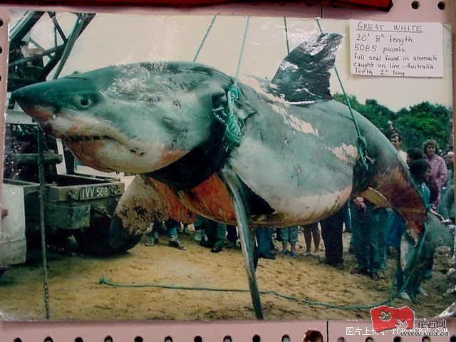 澳大里亚南部捕获的大白鲨,19.85英尺长,5085磅重,牙间距2寸半。