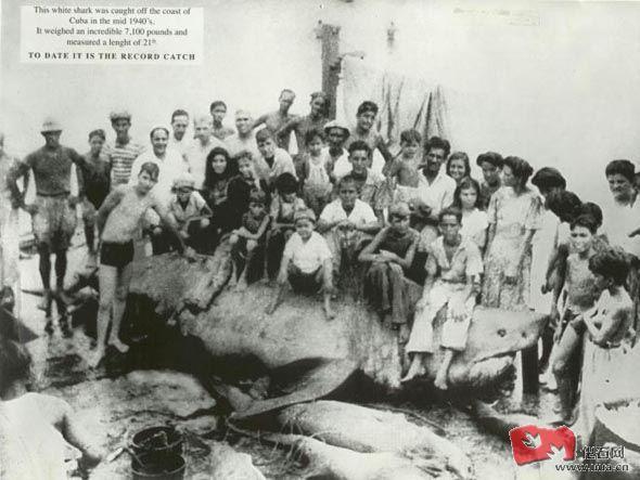 40年代古巴捕获的21尺长大白鲨,重2吨多,最大牙间距2.87寸