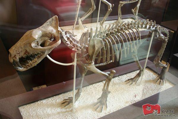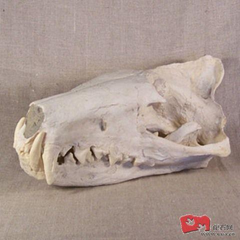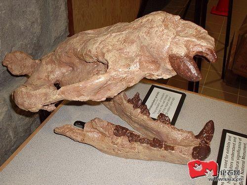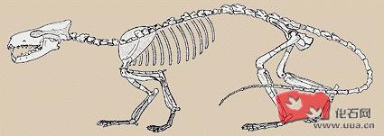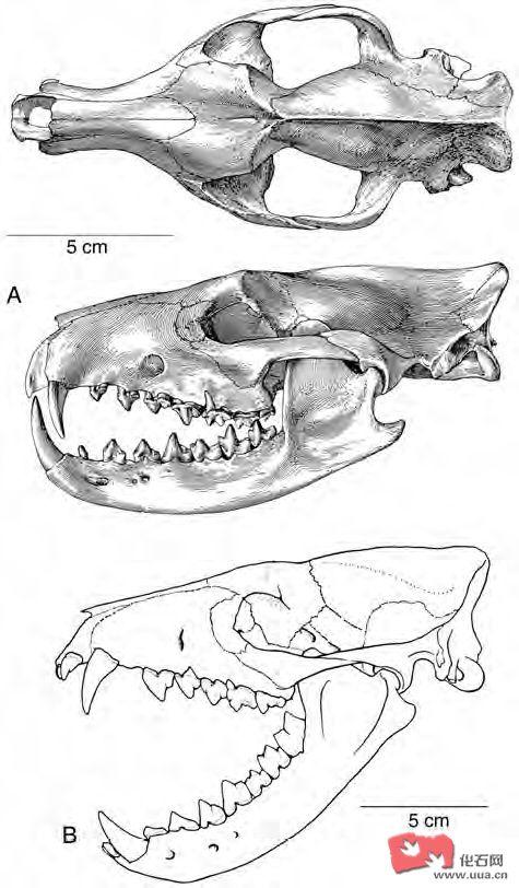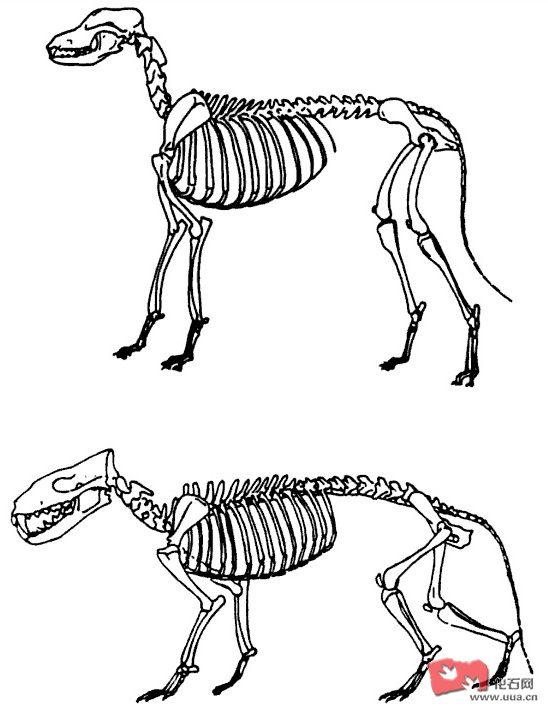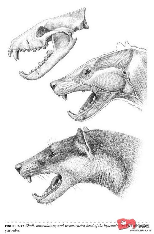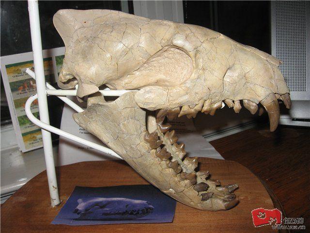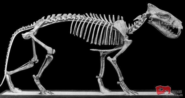 补充一张家犬和Hyaenodon horridus的骨骼对比图,可以看出Hyaenodon的脑袋比犬科动物大的多。