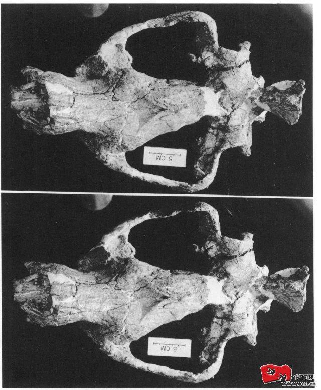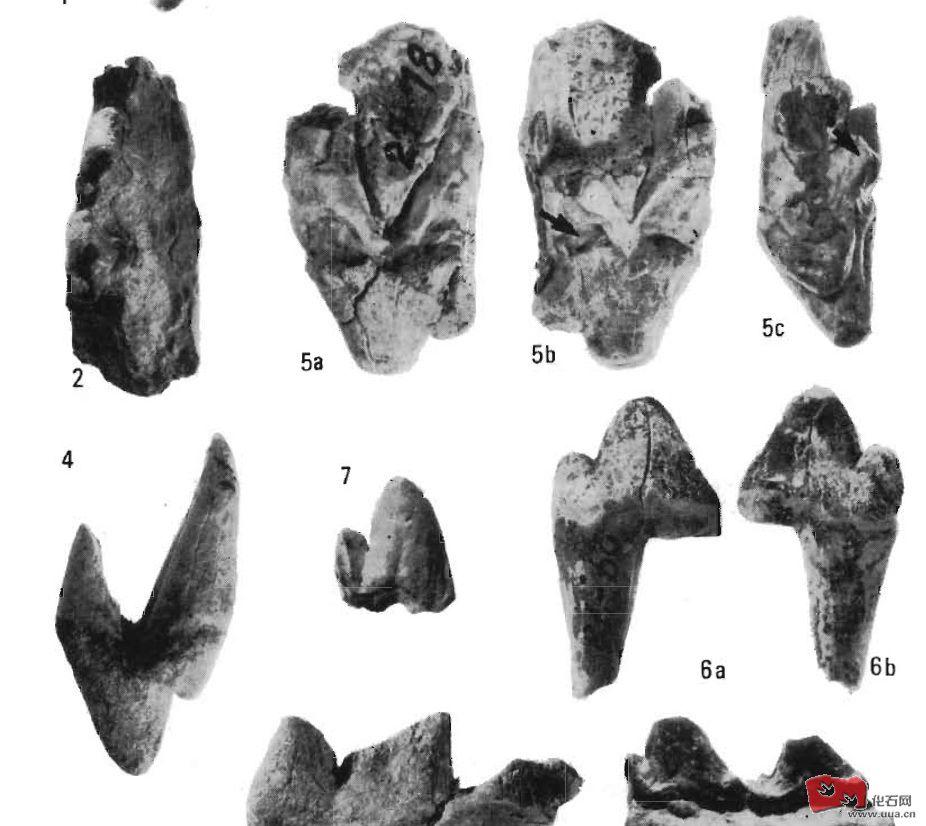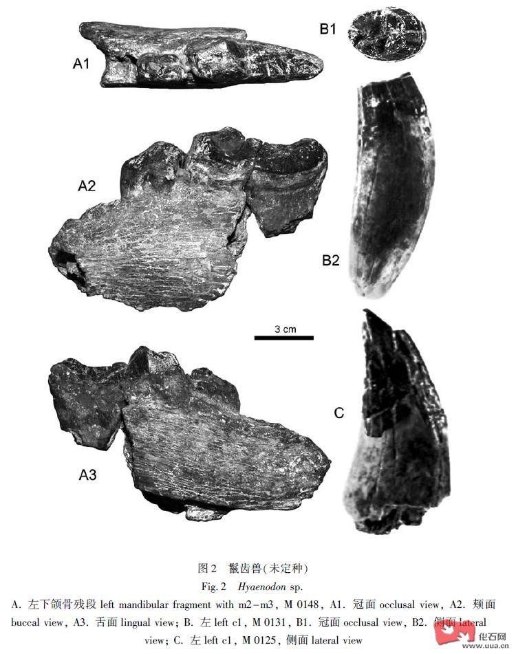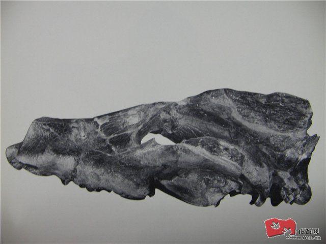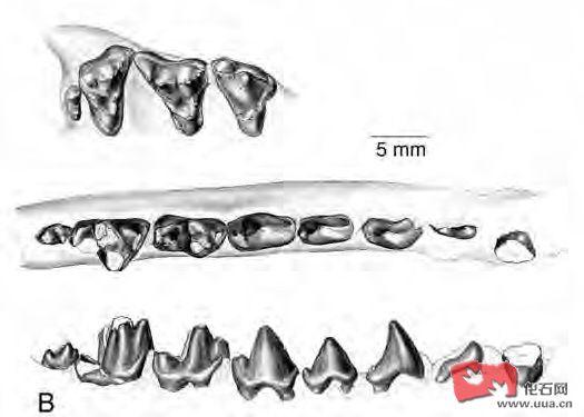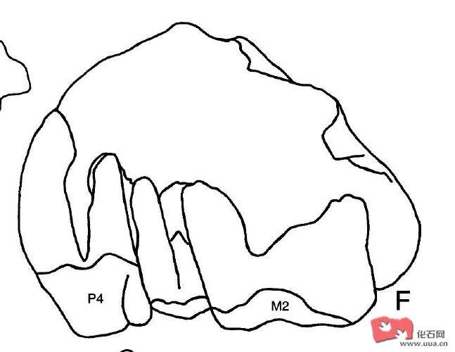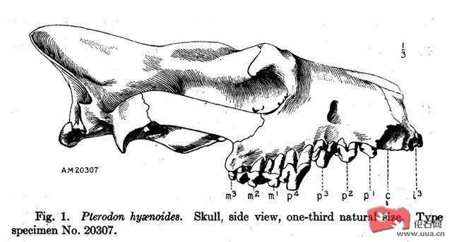 图1:Hyaenodon gigas的正模标本PST 27-10就是一块左上颌骨碎片,上面有P4–M2,由Dashzeveg描述。