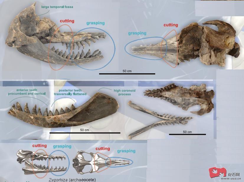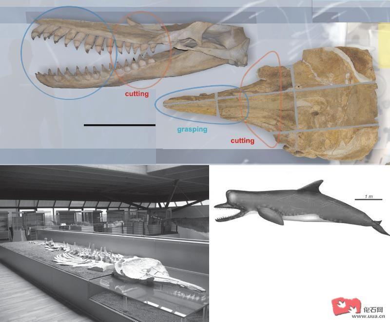 恐齿弓抹香鲸(Acrophyseter deinodon)化石被发现在秘鲁 , 化石属晚中新世(600万年前) , 恐齿弓抹香鲸(Acrophyseter deinodon)颅骨长约90厘米 , 上颌每边各有12颗牙齿 , 下颌每边各有13颗牙齿 , 最大的牙齿直径为颅长的3.5% , 颞窝长度为颅长的37% , 从恐齿弓抹香鲸(Acrophyseter deinodon)的头骨长度判断体长约3.9米至4.3米。恐齿弓抹香鲸(Acrophyseter deinodon)及巴罗拉颧突抹香鲸(Zygophyseter varolai)的吻端呈管状 , 吻端的圆锥型牙齿平伏并相互锁合 , 能有效抓捕猎物 , 下颌后列的牙齿横向性平坦 , 能把猎物切成碎块。恐齿弓抹香鲸(Acrophyseter deinodon)及巴罗拉颧突抹香鲸(Zygophyseter varolai)的进食方式大概和古鲸亚目及鲨齿鲸科等具异型齿的齿鲸类相似 , 古鲸亚目及鲨齿鲸类同样有着圆锥型及锋利的前牙及犬齿 , 臼齿及前臼齿呈三角型且横向平坦。