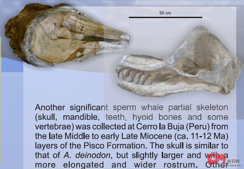 在日本水户市(Mito)也发现了中新世中期的掠食性抹香鲸类的下颌骨及牙齿化石(化石样本NSM-PV 2219) , 化石样本NSM-PV 2219牙齿型态和化石样本INM-4-012885的相似 , 两者的发现地相当接近 , 并且属同一时期 , 化石样本NSM-PV 2219是另一个在日本发现的类似斯卡尔鲸属 (Scaldicetus)的掠食性抹香鲸类化石。