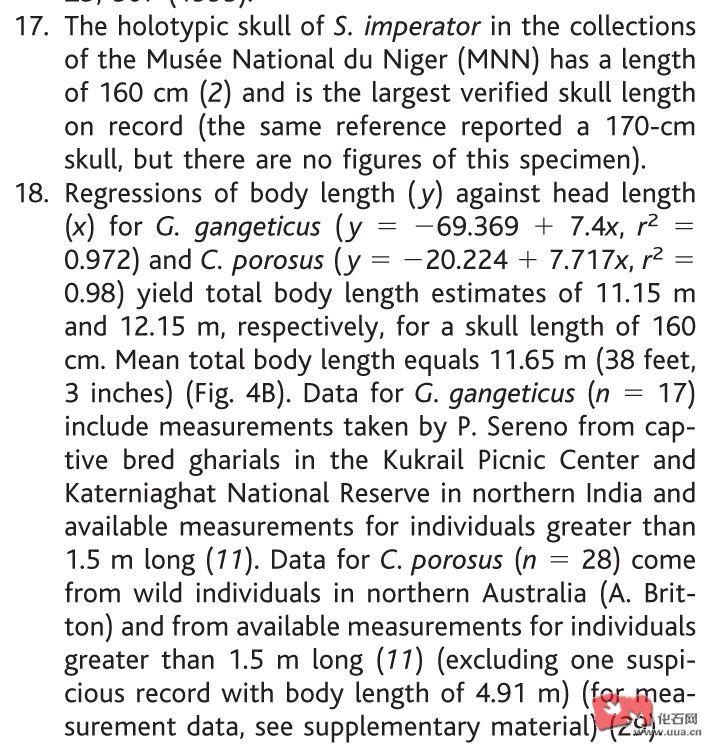 帝王鳄正模全长度是160厘米,还有一个170厘米(HL~160厘米),那么全长170厘米的按湾鳄推测12.15米,按恒河鳄11.15米,