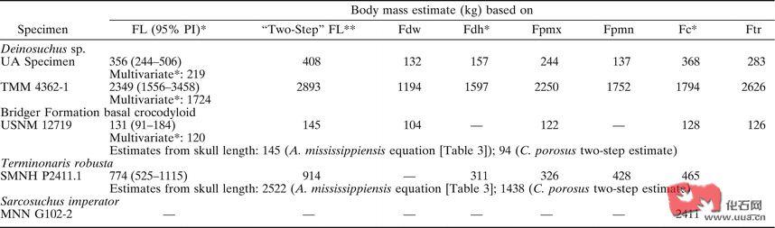最大的帝王鳄也不是都是8吨的推测,帝王肌鳄MNN G102-2按照野生密河鳄(*代表是按完全按照野生个体估算的),估算的长度9.1米(见楼上表格,携带*),体重2410kg,比它大33%的最大帝王肌鳄(MNN 604)大概按股骨周长增长指数(2.125~2.85)推测大概是4417~5432kg,这个大概和FNMH PR 2081霸王龙5543~6197kg,南巨5390~5653kg或者棘龙8845~10181kg差不多,如果帝王鳄8吨,大概对应FNMH PR 2081 10吨,棘龙20吨。