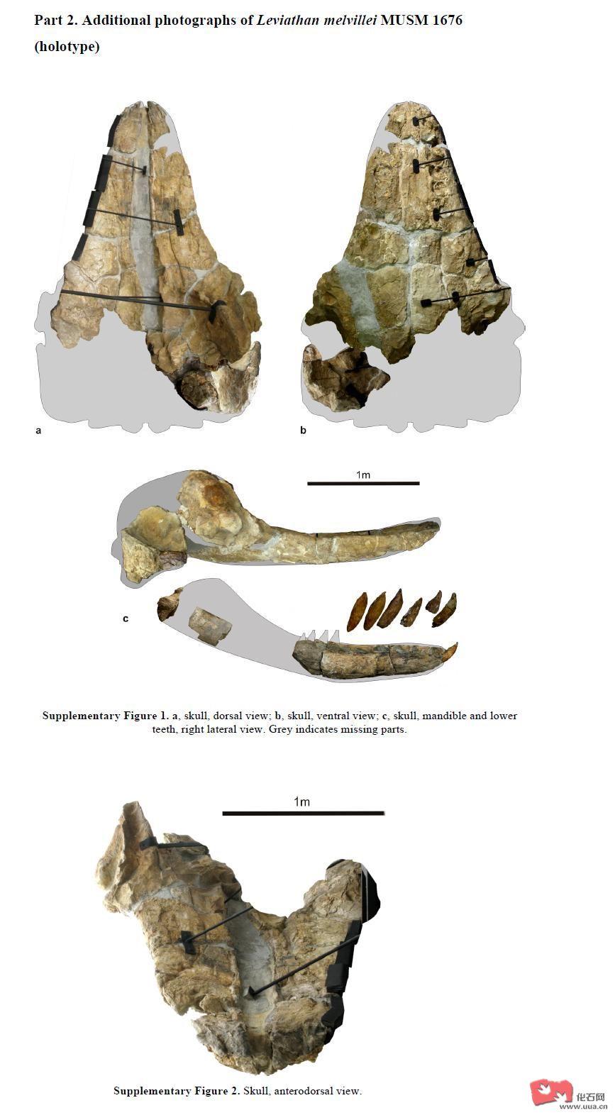 麦尔利维坦鲸 (Leviathan melvillei)有部分头骨 , 下颌及牙齿化石发现 , 整个头部长约3米 , 有非常大的上颌及下颌牙齿 , 最大的牙齿长约36厘米及宽达12厘米 , 有粗状的颌骨 , 颞窝(temporal fossa)比今天的抹香鲸要大显示麦尔利维坦鲸 (Leviathan melvillei)有极大的咬合力。由于中新世时期须鲸类迅速分化并且体型开始变大 , 麦尔利维坦鲸 (Leviathan melvillei)被认为会捕食中小型须鲸类 , 牠们甚至和可怕的巨齿鲨(根据新的公式推算最大可达20米)存有激烈的竞争。麦尔利维坦鲸 (Leviathan melvillei) 有广阔的骨盆(supracranial basin )并延至吻突之上 , 这显示牠可能是存有鲸脑油但和深潜或以抽吸方式抓捕猎物没关。