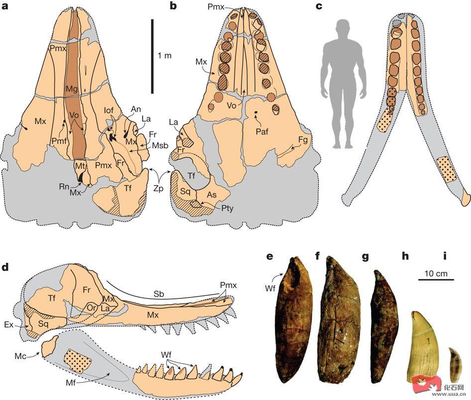 The 12-million-year-old skull _ which measures nearly 10 feet across _ belonged to a now-extinct genus and species of sperm whale that could have been as much as 57 feet long. The fossil includes the longest documented sperm whale teeth, measuring more than 14 fearsome inches.