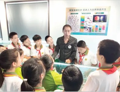 ↑ 白志君在矿区南楼小学“聆听化石故事,走进远古世界”科普活动中作现场讲解。