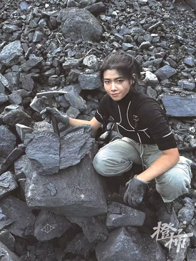 “手臂和腰都震得酸痛,我决定放弃快要离开的时候,突然注意到一块石头,卡在两块大石头中间,露出了小菊石皮壳。直觉告诉我,这里可能会有东西,一定得敲开看看。”