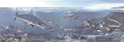 由化石标本还原的李家镇一带古海洋生态系统,最大的就是旋齿鲨。 图片来源:浙江省地质院