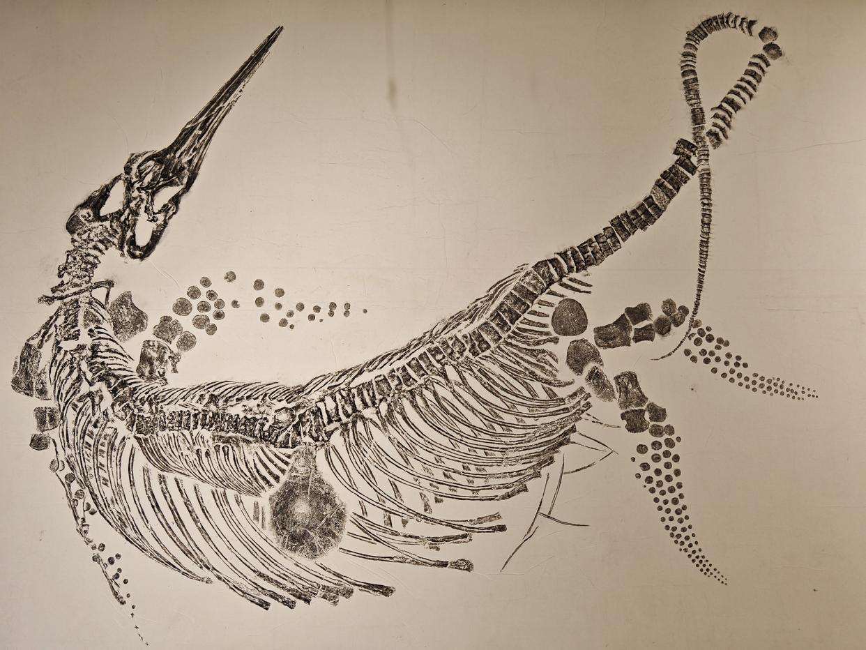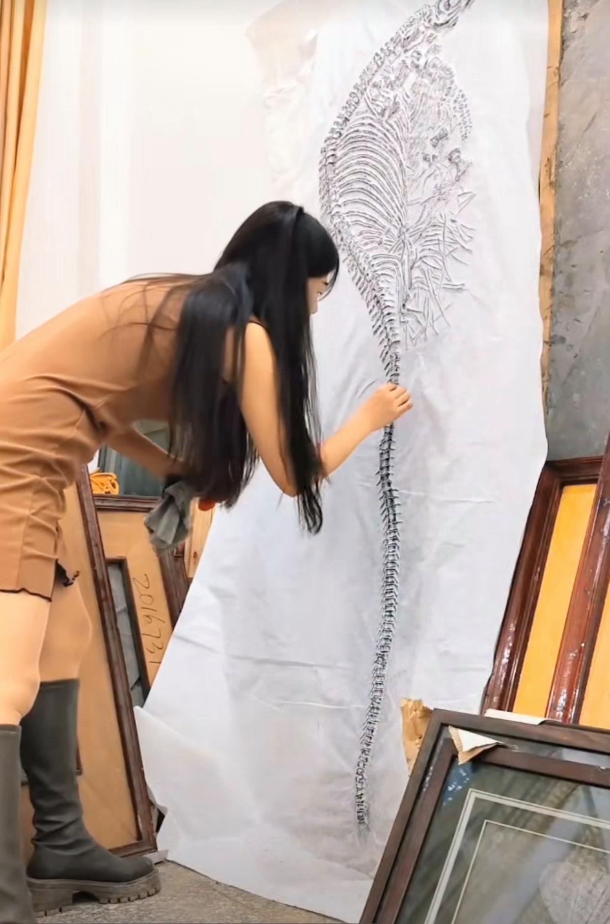 紧接着重头戏来了,那就是“镇馆之宝”——世界上目前已知最大、保存最完整的美丽盘江鱼龙化石和馆藏最大海百合化石的拓印工作。