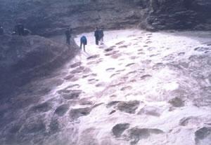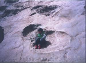 刘家峡白垩纪恐龙足印群地质遗迹位于太极湖北岸。1999年8月,甘肃省地勘局第三地质矿产勘查院古生物中心在进行古生物地层调查工作过程中,在永靖县盐锅峡镇老虎口一带的2平方公里范围内发现10个恐龙足印化石的出露点。经过岩性和岩相分析,筛选出其中的1、2、4号点进行追踪挖掘。经过一年半时间的人工揭露,目前,已揭露面积达710平方米,产8类30组270个足印(截止5月20日)。其中,1号点揭露面积600平方米,包括上、下两层足印,其下层层面分布有16组183个足印,上层层面上分布有2组8个足印,其间相隔6.5米厚的砂、泥岩层;2号点80平方米,分布有9组61个足印;4号点30平方米,分布3组18个足印。经初步鉴定,这些足印至少包括两类巨型蜥脚类、两类兽脚类、一类似鸟龙类和其它三类型态独特、尚未归属的足印。在同地点出现如此多样的种类,在世界上极为罕见。其中,最大的一组蜥脚类足印后足印长150厘米,宽120厘米,前后两足印步幅375厘米,左右足印外侧缘间距345厘米,大小为世界之最,而且该类足印前足小,后足大,前后足足印成对出现并有规律地部分叠覆,为国内外首次发现。同时,在同一地点的不同层面上发现不同类型的恐龙足印,亦属世界罕见。此外,还发现有恐龙卧迹、尾部拖痕及粪迹等,构成了足印、卧迹、拖痕和粪化石共存的场面,因而非常独特。2001年2月下旬以来,又在足印出露点附近地区多处发现恐龙骨骼化石,从而使该地质遗迹具有十分重大的保护和科学研究价值。