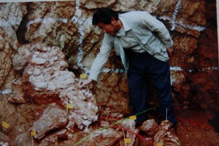 接到盛昌林的报告,科考队于当天下午赶赴现场,会同县文物管理所及孙村镇有关负责人,对塌方现场进行保护和清理。5月13日至6月6日,清理、试掘工作进行了25天,共发现灵长类上颌骨4块、下颌骨5块、牙齿45颗;出土脊椎动物化石计有龟鳖类、鸟类、翼手类、啮齿类、食肉类、长鼻类、奇蹄类、偶蹄类等近50种;同时采集到了几件疑为人工制品的石英片麻岩、硅质灰岩标本,后经权威旧石器考古学家考证,确定了其人工性质。