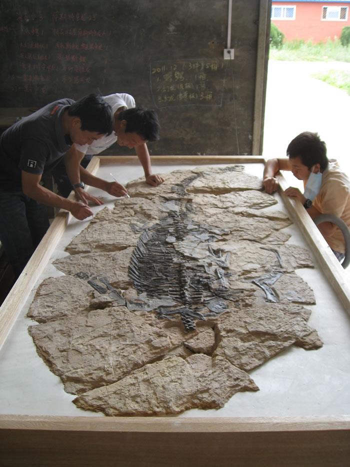 2007年5月,中科院古脊椎所研究员李淳交给丁今朝一件据称是“楯齿龙”的标本。“这件标本长约50厘米,当时几乎完全被包裹在围岩中,仅能观察到它若隐若现的大致轮廓。”依据经验,丁今朝看得出这标本的甲壳不是楯齿龙类常见的圆形结构,而且不甚规则,甲壳两边像有张开的对称的骨板。