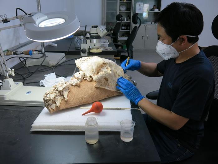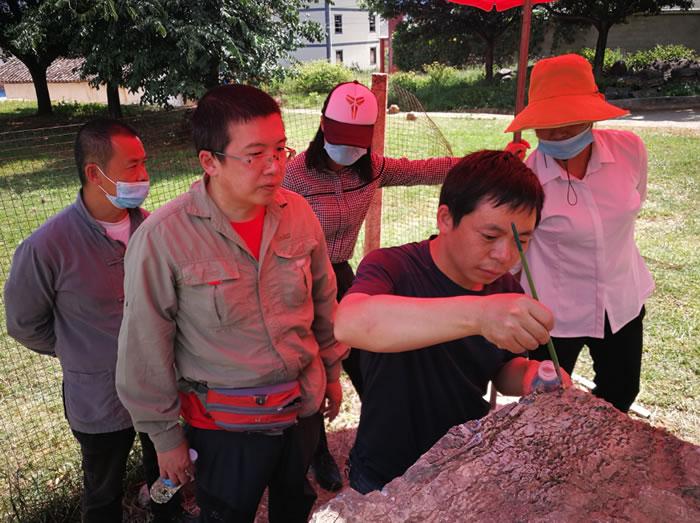 丁今朝在云南丽江为边屯博物馆淳信龙化石进行修理和保护