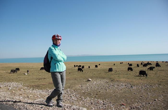 张东菊在青海湖的发掘工地附近,她说风景美极了。