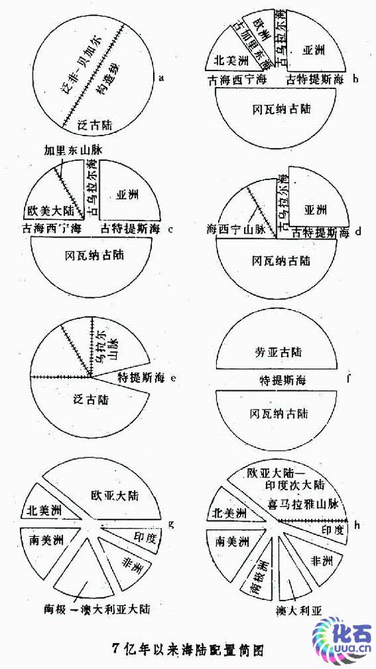 洋盆演化史 在地球演化的历史中,大洋与大陆经常改变它们的地理位置、配置形式,以及它们的大小与数量。洋底扩张、大陆漂移,即板块分裂与聚合的作用至少已有 7亿年了,它们也许还可能有长达20多亿年的历史。在过去的 7亿年历史中,大洋与大陆的相对轮廓、配置形式和变化状况留下了比较明显的痕迹,可供人们对它作初步的探索。大约7亿年前的元古代末期,地球上只存在着一个超级大洋──泛古洋和一个超级大陆──泛古陆,泛古陆是由以前分离的大陆组成的,泛非-贝加尔构造线便是它们的板块缝合线(图a)。距今 5.7亿年的寒武纪,泛古洋继续存在,它可能就是太平洋的前身。当时地球上存在着 4个大海和 4个大陆,它们是古海西宁海、古加里东海、古乌拉尔海和古特提斯海,北美洲、欧洲、亚洲和冈瓦纳古陆(图b)。距今 3.7亿年左右的泥盆纪,古老的欧洲与北美洲板块碰撞,合并成欧美大陆,古加里东海消亡,出现加里东山脉(图c)。距今 3亿年的晚石炭纪,欧美大陆沿海西宁构造带与冈瓦纳古陆连接起来,古海西宁海消亡(图d)约2.25亿年前的二叠纪,亚洲沿乌拉尔构造带与欧洲大陆合并,重新组成泛古陆,古乌拉尔海消亡。但古特提斯海仍然存在,它改变形态,以一个三角形的海楔入泛古陆之中,再逐步演化成后来的特提斯海(图e)。这时作为太平洋前身的泛古洋仍继续存在。距今大约1.9亿年的中生代──侏罗纪早期,从墨西哥湾到直布罗陀一线张裂开来,承袭泛古洋的太平洋分出一支切入墨西哥湾,称为太平洋海。它与由东向西而发育伸展过来的特提斯海相连在一起,把一个超级大陆──泛古陆分隔成两个大陆,即北边的劳亚古陆和南边的冈瓦纳古陆(图f);这时太平洋已正式形成,现代太平洋西北部洋底所发现的年龄近 2亿年的洋壳就是这种证明。距今 1.35~1.1亿年间的早白垩世,南大西洋开始张裂,生成洋盆,而后欧洲与北美洲分裂,因而冈瓦纳古陆和劳亚古陆也开始破裂。在距今 0.7亿年的晚白垩世,劳亚古陆和冈瓦纳古陆都高度分裂,大西洋、印度洋和南大洋相继出现;两个古陆崩解后形成了欧亚大陆、北美大陆、南美大陆、非洲大陆、印度次大陆和南极洲-澳大利亚(图g)。从距今0.65亿年的古新世以来,格陵兰与斯堪的纳维亚分裂,挪威海与格陵兰海形成,北冰洋与大西洋连通。距今0.53亿年的始新世初,澳大利亚裂离南极洲,并开始向北漂移;距今 0.4亿年的始新世晚期印度与亚洲主体碰撞,特提斯海东段关闭(图h);约0.18亿年前的中新世期间,阿拉伯与亚洲主体碰撞,特提斯海西段部分关闭,遗留下西通大西洋的地中海;约 0.035亿年前的上新世时,北美与南美重新相逢连通,巴拿马地峡升起,切断了大西洋与太平洋的直接通道,强烈地改变了大洋水的环流系统。