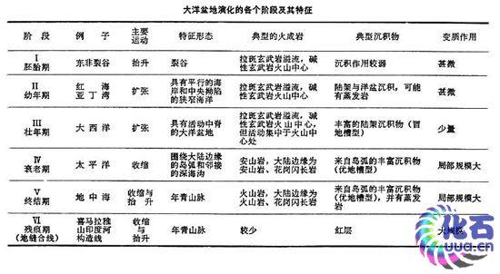 洋盆的发展阶段 J.T.威尔逊等将大洋盆的演化划分成两大阶段,即成长阶段与衰退阶段。每个阶段又各分三个时期:成长阶段分为胚胎期、幼年期和壮年期,衰退阶段分为衰老期、终结期和残痕期(见表)。有人将上述演化阶段称为威尔逊旋回。