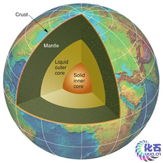 地球的核心部分。主要由铁、镍元素组成,半径为3480千米。地核又分为外地核和内地核两部分。外地核的物质为液态。