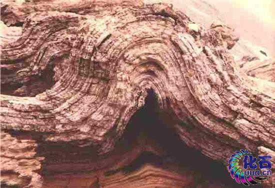 岩石中面状构造(层理、劈理、断层面等)的弯曲。又称褶曲。是常见的地质构造。向上凸曲称背形,向上凹曲称向形。若组成褶皱的多层间的时代顺序清楚,则核心为较老岩层向两侧依次渐新的褶皱称背斜,核心为较新岩层向两侧依次渐老的褶皱称向斜。背斜和向斜是褶皱的两种基本形式。单个褶皱大者可延伸数十千米,小者在显微镜下才能见到。