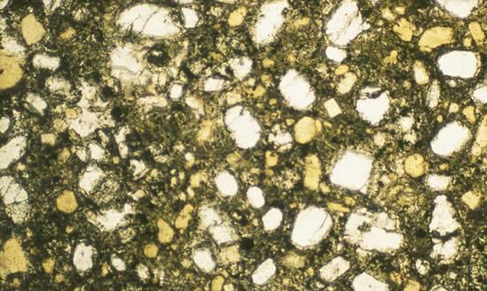 常具斑状结构、细粒结构和火山碎屑结构。块状构造和角砾状构造。呈斑状结构的,斑晶主要为橄榄石和金云母,橄榄石呈浑圆状并普遍受到强烈的蛇纹石化和碳酸盐化蚀变;基质呈显微斑状结构,由橄榄石、金云母、磁铁矿、铬铁矿、钛铁矿、钙钛矿、磷灰石等组成。呈角砾状构造的,角砾成分复杂,有来自上地幔的碎块,也有来自浅部围岩的碎块。大量角砾的存在反映了金伯利岩岩浆具有爆发作用的特征。