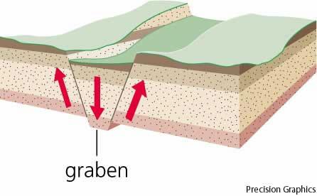 地堑大多发育在地壳受拉伸地区。在水平拉张作用下,地壳在垂向上减薄,在上部形成两组剖面上共轭的高角度正断层,其间的地块下降,就形成地堑。在两个倾向相背的断层中间则形成地垒。地堑常与沉积矿产,尤其是煤和油气藏等密切相关。著名的地堑有欧洲的莱茵地堑,中国晋陕的汾渭地堑等。
