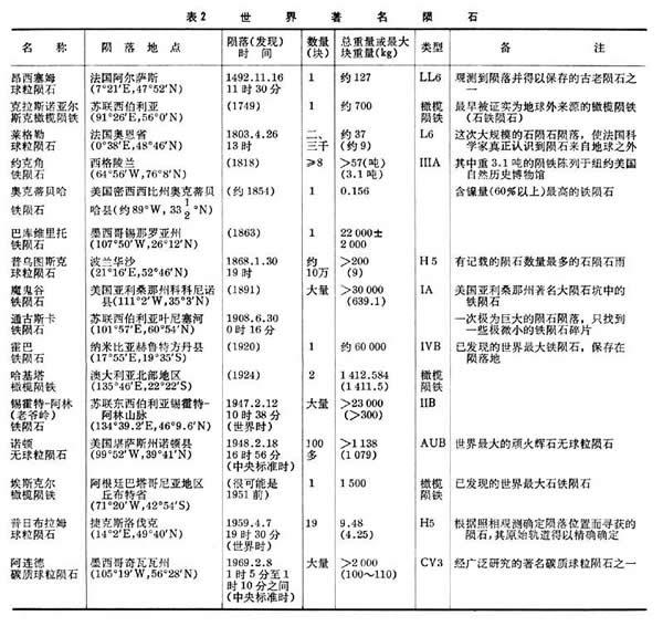1966年,英国不列颠自然历史博物馆出版的《陨石目录》共列举了2045次陨落的陨石;1976年出版的《陨石补充目录》,又增补了新陨落和新发现的陨石264次。