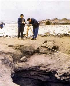 吉林陨石雨降落现场,陨石雨中最大的一块陨石陷入地下6.5米深,形成一个直径2米多的大坑,中国科学工作者正在进行现场考察。