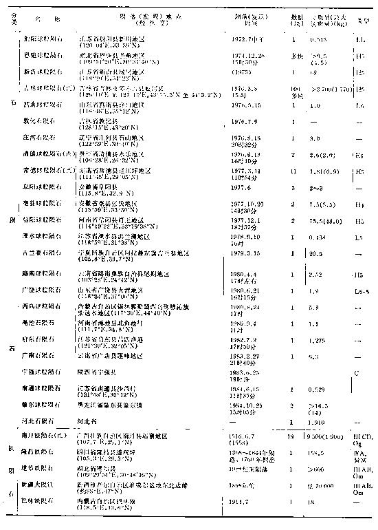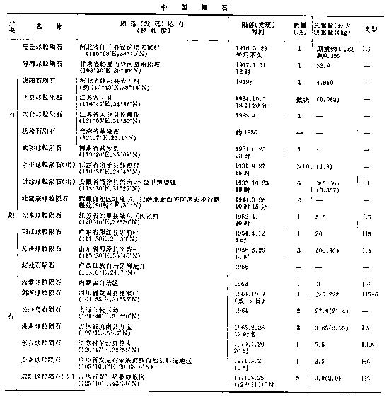 在中国收集的74次陨落的陨石中,石陨石45次(约占61%),铁陨石28次(约占38%),石铁陨石1次(约占1%)。其中属陨石雨性质的有7次。