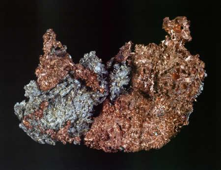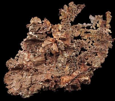 化学成分为Cu、晶体属等轴晶系的自然元素矿物。往往含有微量的铁、银、金等元素。很少见到完整晶形。常见片状、板状、块状及不规则的树枝状集合体,新鲜面呈铜红色,金属光泽,表面常氧化成棕黑色或绿色。摩斯硬度2.5~3,比重8.9。断口呈锯齿状。有良好的导电性和导热性,延展性好,熔点1083℃。自然铜大量聚集时可作为铜矿开采。它普遍产于硫化物矿床的氧化带中,与赤铜矿、孔雀石、褐铁矿等共生;还以砂砾岩的胶结物及基性熔岩中裂隙和气孔的充填物产出,形成很大的自然铜矿床。也产于结晶片岩及粘土岩中。