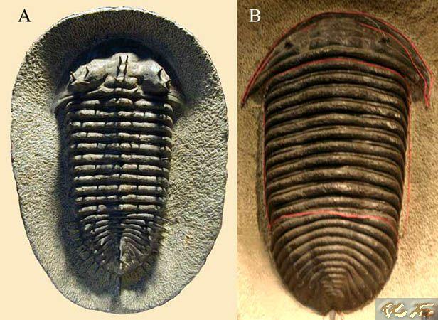 A图中,红线指示的部分是树脂部分,其他部分是真实的三叶虫,但是看上去右边似乎是坏的,因为右边的刺要短一些。