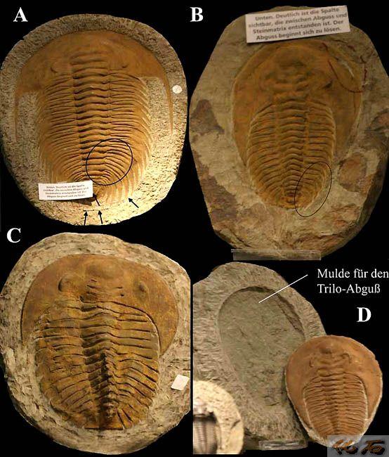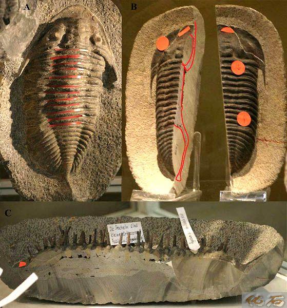 A图是一个着色的铸模三叶虫Acadoparadoxides。被放在一个人工雕刻的石头的底板上。箭头的地方指示石头和树脂并不是结合的非常好。