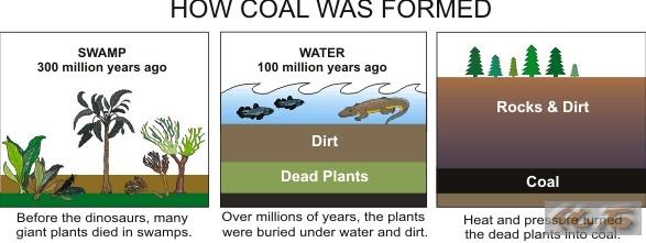 右:岩石与泥土,在温度和压力作用下,死亡的植物体转变成了煤。