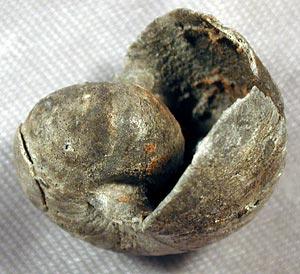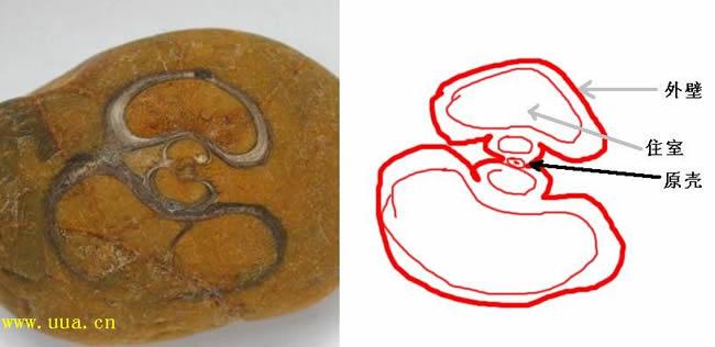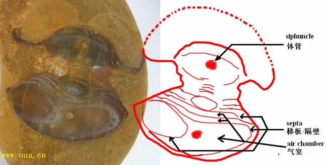 首先来观察这枚被认为是三叶虫的标本。通过右面的解释图我们可以发现。该标本的空腔内明显的显示了两个圆形斑点。事实上,这是头足类动物的外体管形成的孔洞。在动物生活的时候,这个空洞被肉质的体管索所填充,以控制升降及其运动。