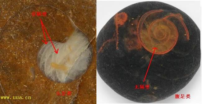 但是左边的可以观察到明显的隔板。而且隔板形态简单,呈锅底状。为典型的鹦鹉螺类动物的形态。