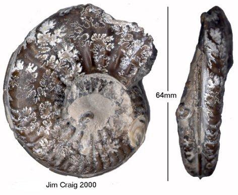 这是鹦鹉螺类头足动物(Nautiloid cephalopods)Eutrephoceras clementinum 的照片,大家可以对比上面的菊石。两者的缝合线完全不一样,下者要简单的多。