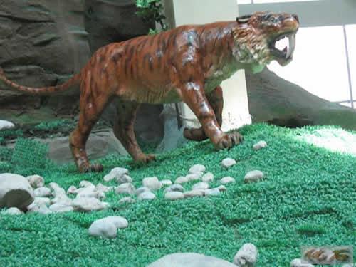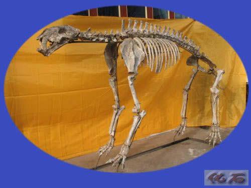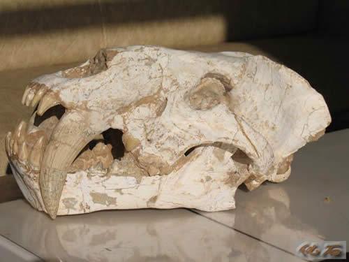 剑齿虎:在凶猛的猫科动物中,剑齿虎是中型或大型的非常特化的类型,剑齿虎的大小与现代的狮子或豹子差不多。作为猫科动物的一员,剑齿虎与它的现代亲戚一样,具有可收缩的锋利的爪子,其牙齿数目减少,上下裂齿的刃叶长而且非常锋利。剑齿虎最大的特点是其长而侧扁弯曲的上犬齿,形同匕首一般,前后还具有锋利的刃嵴,这就是其名称“剑齿”的来源。相反,剑齿虎的下犬却退化缩小了。剑齿虎下颌骨的最大特点是具有非常明显的颏突,通俗地说,就是它的下巴颏特别发达,几乎成一个直角型。