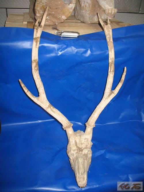 龙担日本鹿:日本鹿是中等大小的六角枝鹿类,即它的每一个角是有三个角枝,其眉枝高,主枝长而直。日本鹿的角细长,断面圆或稍扁,角面纹饰以沟为主,第二分叉非常高,第二、三角枝在长短和粗细上相差不大。龙担日本鹿以和政地区的化石地点龙担命名,是一种大型的日本鹿。龙担日本鹿眉枝这一点足以使它和现生的每角三角枝的水鹿和轴鹿区别开来。日本鹿的眉枝与主枝间的夹角大,且较弯曲是与水鹿进一步区别的特征。与所有已知日本鹿的各种相比,龙担日本鹿都是最大的。