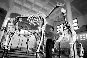 记者昨天到展厅采访时,6件古生物骨架化石架已完全搭架完毕,每一块骨化石都用铁架或铜丝固定好了。