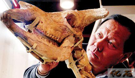 上海科技馆专家底野力正在修复迄今发现的唯一的“和政羊”化石头盖骨
