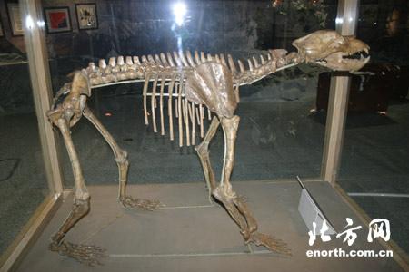周口店北京遗址博物馆的部分珍品化石也于22日来津。这些标本展现了周口店遗址的两种古人类——“北京人”和山顶洞人的生活,体现了他们的风采。这是在山顶洞内发现的洞熊的完整骨架化石。