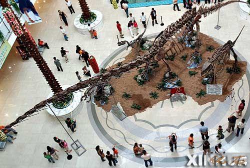 近日,山西省太原市一家大型商场举行恐龙化石展,展出马门溪龙、上游永川龙、鹦鹉嘴龙等九具恐龙化石,吸引前来购物的顾客驻足观看。