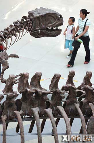 9月2日,一位母亲带着女儿在太原一家大型商场内观看展出的恐龙化石 (图2)