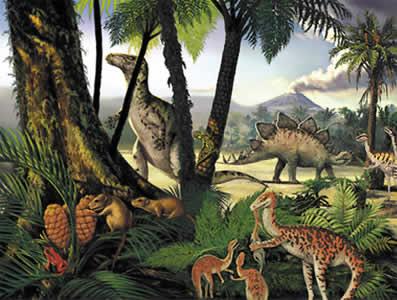 侏罗纪是地史上海侵比较广泛的一个纪,又是地史上植物界最为均一少变的时期。其整个生物界反应了典型的中生代面貌。爬行动物、菊石和裸子植物极度繁盛。植物界以裸子植物中的苏铁类、松柏类和银杏类为主。蕨类植物中真蕨类仍很重要和常见。自中侏罗世起欧亚大陆地势分异和气候分带现象重新加强,从而又出现了横贯欧亚的植物区。在南欧、中南亚和东南亚热带植物区,以苏铁类为其特征。在北极附近的斯匹次培根地区,则以松柏类为主。介于两者之间的西伯利亚温凉植物区则多松柏类和银杏类。