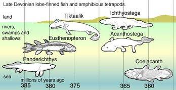 由于志留纪末加里东运动的影响,促进了泥盆纪生物界的重大变化。陆生植物进一步发展,早、中泥盆世以裸蕨植物为主。早泥盆世后期出现了原始的石松类,中泥盆世出现了原始鳞木、原始楔叶类和原始真蕨类,至晚泥盆世出现了原始石松类的斜方薄鳞木和裸子植物的古蕨羊齿。海生动物中的正笔石类中只有单笔石延续到早泥盆世,三叶虫大量减少,而四射珊瑚进一步发展,如早至中泥盆世广泛分布的拖鞋珊瑚;腕足类中石燕类极为繁育,穿孔贝类的鸮头贝在中泥盆世分布也很广泛。原始菊石类出现了,如晚泥盆世的棱角石类和海神石类。竹节石和牙形石也很发育。由于无颌类和盾皮鱼类等鱼形动物大量繁育,故又称泥盆纪为“鱼类时代”。如中泥盆世的沟鳞鱼等。泥盆世大西洋动物群与印度洋、太平洋或南太平样动物群没有多大差别,可以合称为欧亚古地中海动物区。