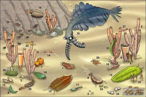 1910年美国科学家在加拿大的布尔吉斯页岩中发现了中寒武纪三叶虫和像蠕虫那样的动物软体的压印化石。第二年夏天,他们又进行了大规模的发掘,得到了除有壳的三叶虫和海绵动物以外的100多种保存得十分完整的无脊椎动物化石,有的像海母、海葵那样的腔肠动物,有的像环节动物,也有象海参那样的棘皮动物......。后来,美国科学家维尔卡特把这些动物称为布尔吉斯动物群。